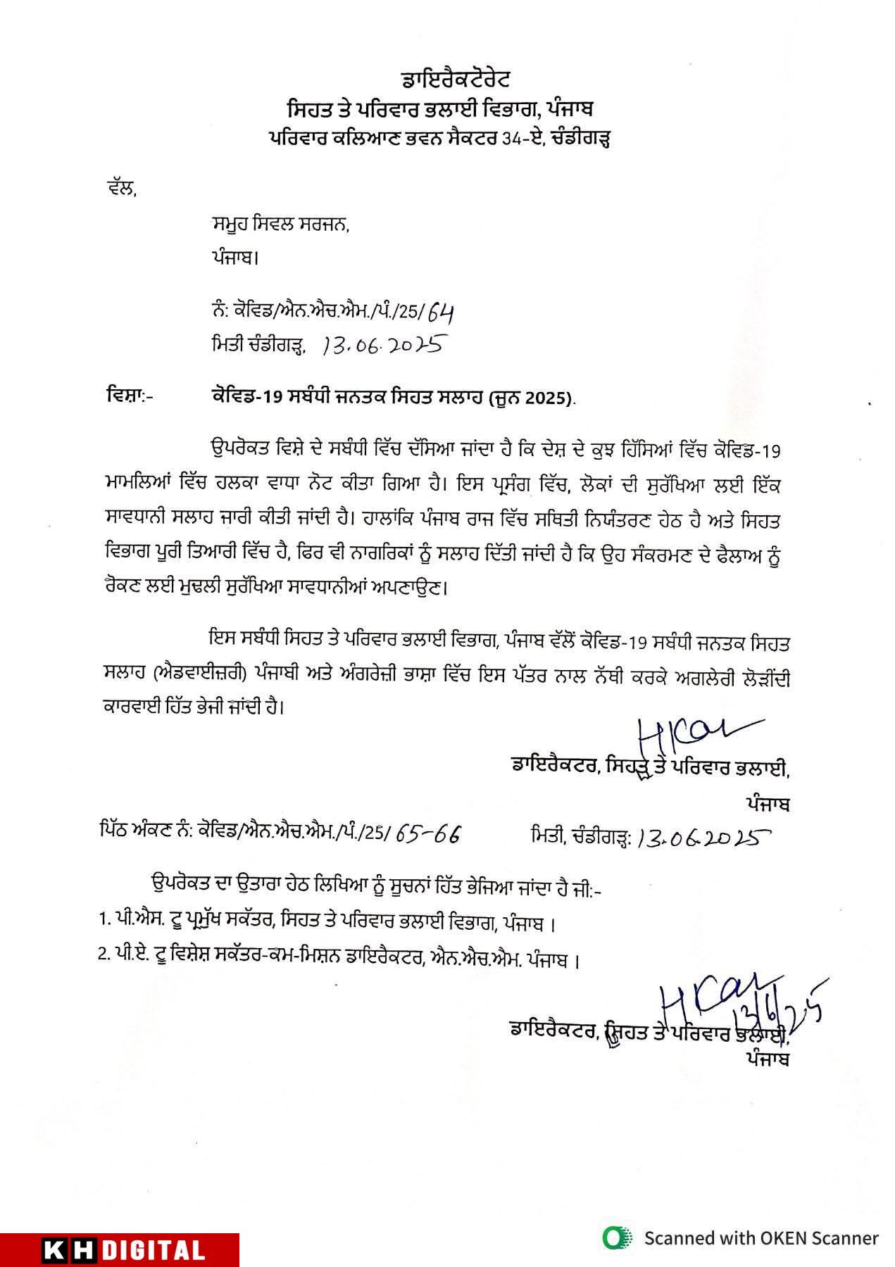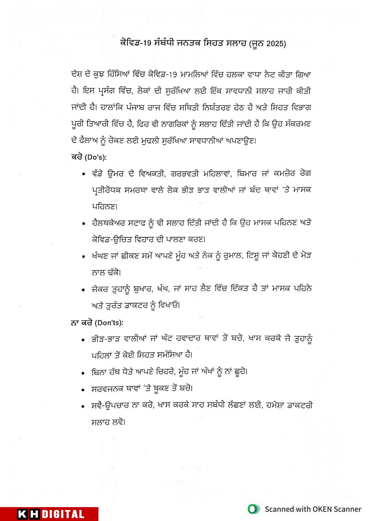 ਦੇਸ਼ ਦੇ ਕੁਝ ਹਿੱਸਿਆਂ ਵਿੱਚ ਕੋਵਿਡ-19 ਮਾਮਲਿਆਂ ਵਿੱਚ ਹਲਕਾ ਵਾਧਾ ਨੋਟ ਕੀਤਾ ਗਿਆ ਹੈ। ਇਸ ਪ੍ਰਸੰਗ ਵਿੱਚ, ਲੋਕਾਂ ਦੀ ਸੁਰੱਖਿਆ ਲਈ ਇੱਕ ਸਾਵਧਾਨੀ ਸਲਾਹ ਜਾਰੀ ਕੀਤੀ ਜਾਂਦੀ ਹੈ। ਹਾਲਾਂਕਿ ਪੰਜਾਬ ਰਾਜ ਵਿੱਚ ਸਥਿਤੀ ਨਿਯੰਤਰਣ ਹੇਠ ਹੈ ਅਤੇ ਸਿਹਤ ਵਿਭਾਗ ਪੂਰੀ ਤਿਆਰੀ ਵਿੱਚ ਹੈ, ਫਿਰ ਵੀ ਨਾਗਰਿਕਾਂ ਨੂੰ ਸਲਾਹ ਦਿੱਤੀ ਜਾਂਦੀ ਹੈ ਕਿ ਉਹ ਸੰਕਰਮਣ ਦੇ ਫੈਲਾਅ ਨੂੰ ਰੋਕਣ ਲਈ ਮੁਢਲੀ ਸੁਰੱਖਿਆ ਸਾਵਧਾਨੀਆਂ ਅਪਣਾਉਣ।